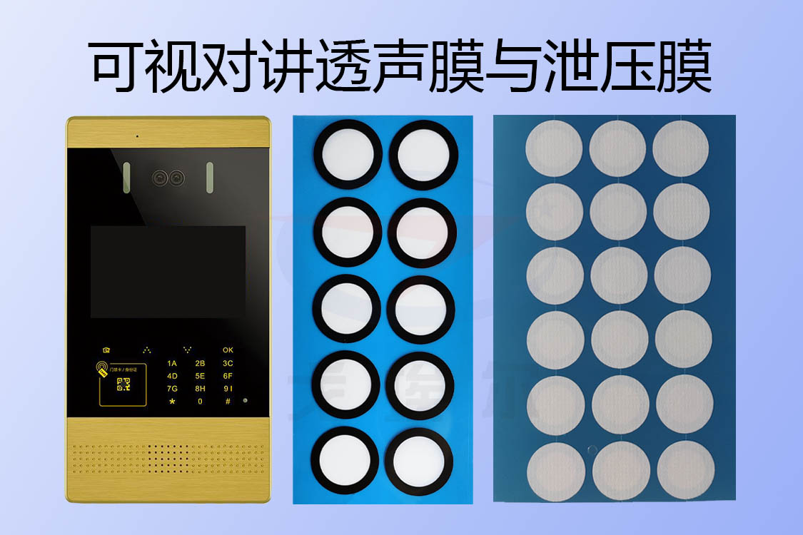 對于可視對講整體防水大多采用的是防水膠或者硅膠點膠實現殼體結構或者屏幕防水密封,有一些會采用防水硅膠密封圈實現密封,在可視對講揚聲器(喇叭)與MIC麥克風的殼體上透聲孔位防水是貼附戈埃爾可視對講防水透聲膜材料來實現防水透聲的,有一些還會裝上喇叭、麥克電聲器件后會采用硅膠點膠工藝去密封實現防水。還有一些可視對講外殼上設有透氣散熱孔,然后貼裝可視對講防水泄壓膜模切加工產品來進行防護,可實現透氣泄壓與散熱降溫這一主要目的,還能實現防塵防水、防潮防腐蝕、壓力平衡等要求。
